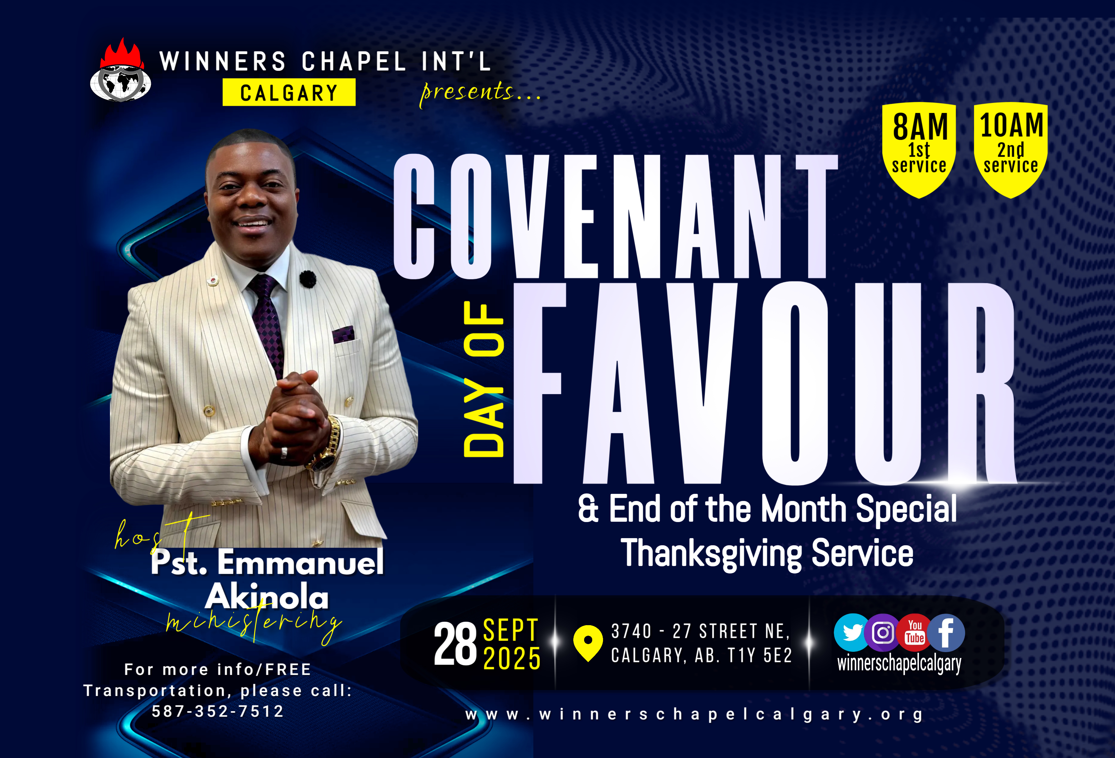 Next Sunday, September 28th, 2025, shall be our Covenant Day of Favour. It shall also double as our End of the Month Special Thanksgiving, Marriage and Children Dedication Service. It shall be a service to be much remembered. If you wish to dedicate your baby, please contact the church office for registration. Invite your new converts, family, friends, and loved ones for a life-changing experience. Service Times: 8:00am and 10:00am respectively.