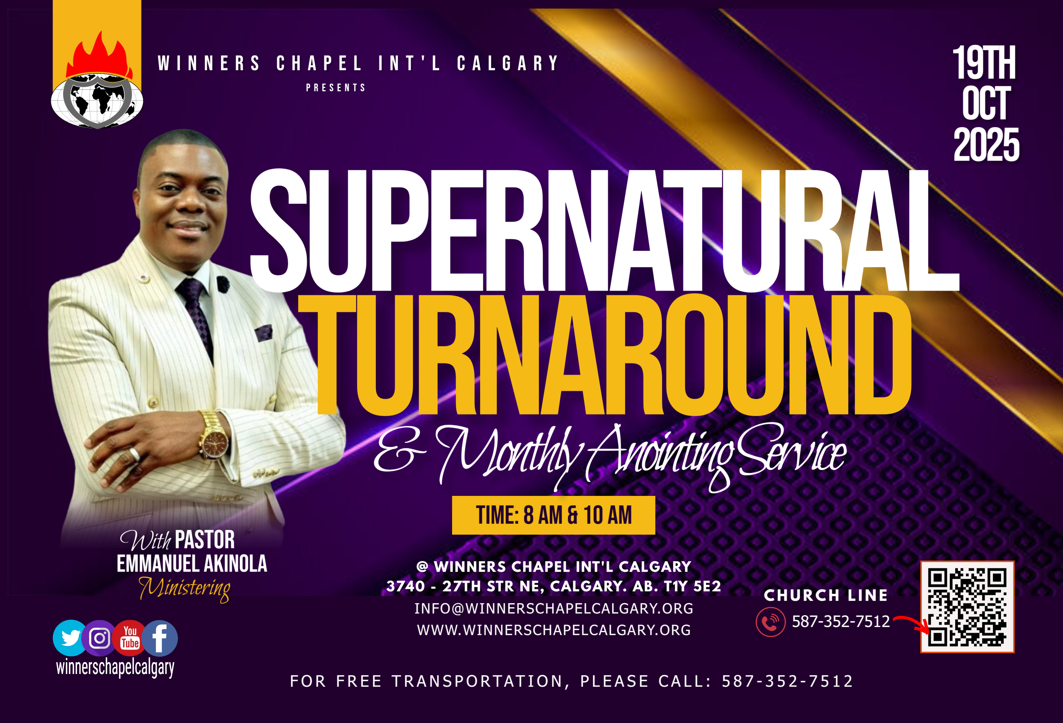 Next Sunday, October 19th, 2025, shall be our Supernatural Turnaround Service, which also doubles as our Special Monthly Anointing Service. Expect to be turned into another man in this anointing service. It shall be a service to be much remembered. Invite your new converts, family, friends, and loved ones for a life-changing experience. Come with your bottles of oil. Service Times: 8:00am and 10:00am respectively.